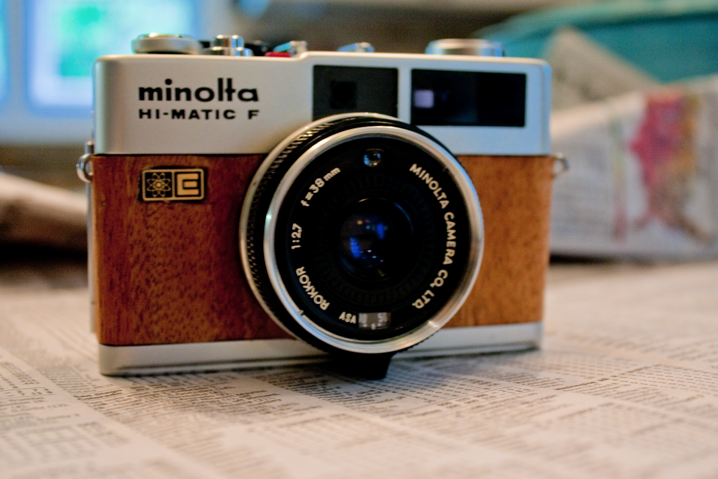 A Minolta Hi-Matic F clad in Mahogany Veneer.